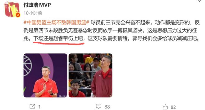 对此,媒体人付政浩也在赛后进行了点评,他写道:“球员前三节完全兴奋不起来,动作都是变形的,反倒是第四节末段胜负无甚悬念时反而放手一搏极其坚决,这是思想压力过大的征兆。下场还是赵睿带伤上吧,这支球队需要情绪。郭导找机会多给球员减减压吧。”