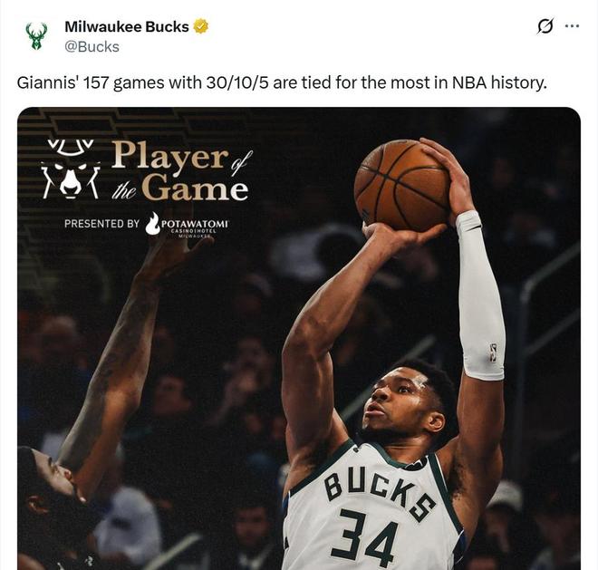 值得一提的是,字母哥在此役还创下了NBA历史第1神迹。雄鹿队官方发布数据显示:这是字母哥生涯第157场单场至少30分10篮板5助攻,追平名宿贾巴尔和奥斯卡·罗伯特森,并列历史第一。