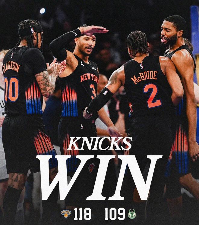 布伦森命中2+1,库兹马、格林相继远投不进,哈特2罚全中,尼克斯领先9分得以锁定胜局。距离终场仅剩19秒,道格里弗斯请求暂停。布伦森抢断罗林斯,布里奇斯暴扣,字母哥扣篮,比赛时间走完。最终,尼克斯以118比109力擒雄鹿,得以上演12分逆转好戏。NBA杯赛卫冕冠军雄鹿小组赛出局。