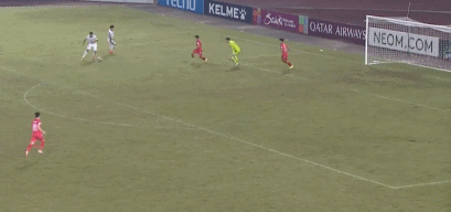 第74分钟,张玉宁单刀突入禁区低射被门将挡出,张玉宁右脚吊射击中横梁。