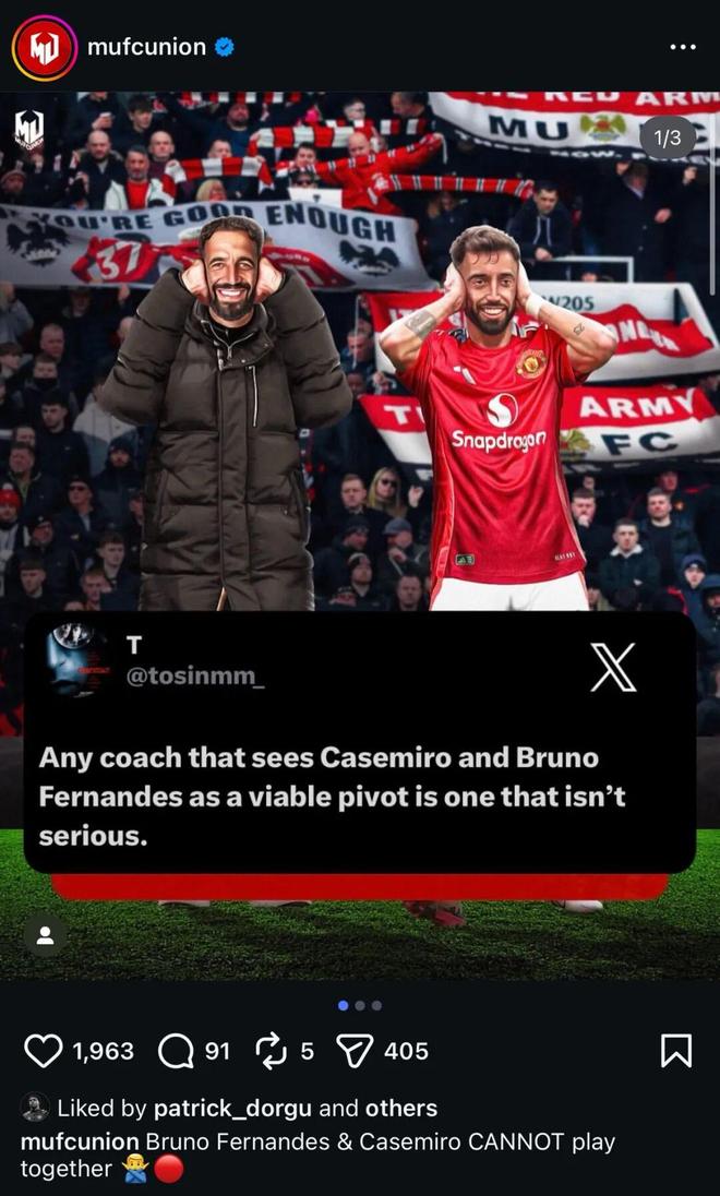 今年1月从莱切加盟球队,阿莫林上任之后的第二笔签约多尔古,他在Instagram上给一条动态点了赞,内容直指阿莫林的中场搭档选择问题:“任何把卡塞米罗+布鲁诺·费尔南德斯视为可行后腰组合的教练都缺乏专业性。”
